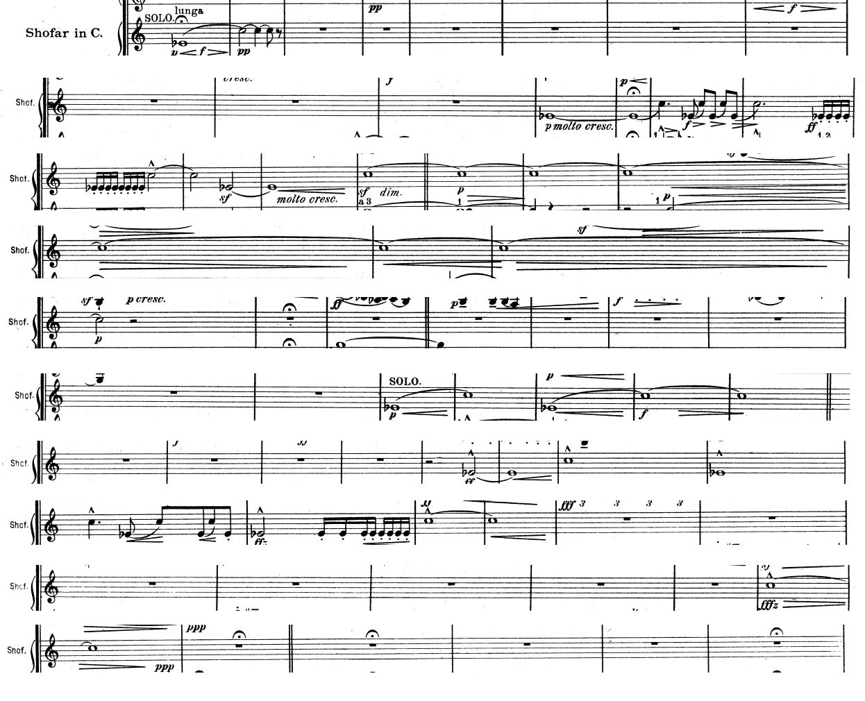「ショファー」(ヘブライの雄羊の角笛)のパートがありますが、もちろん本物の楽器は扱いにくく、音楽的に使うのはほぼ不可能だと聞いているので、使用できません。効果とコントラストのために、目立つ短いパッセージはロングトランペットで演奏していただきたいのですが、トランペット奏者のリストにはモロー氏も含まれていますね。…モロー氏は、あなたの許可があれば、必ずロングトランペットとSHI N I Eを持ってくるでしょう。S T T_R_U_M_M_M_M_M_M_P_E_T!!!! ショファーの「コール」を鳴らすことができます。まさにそれが欲しいのです。
